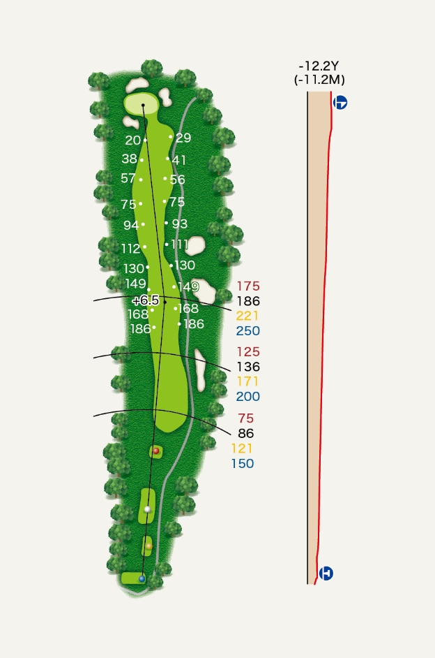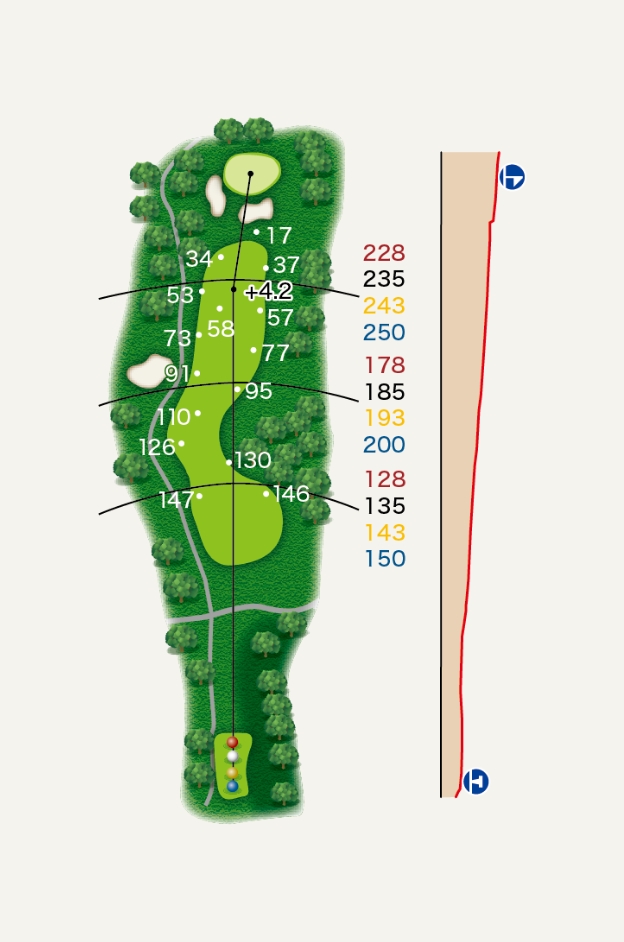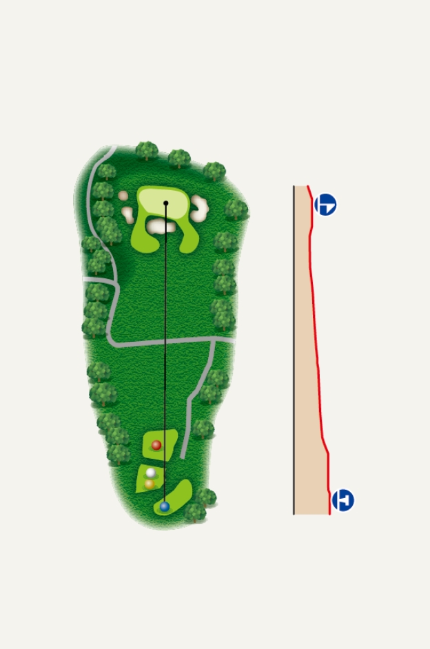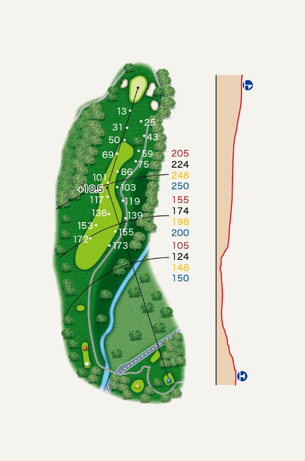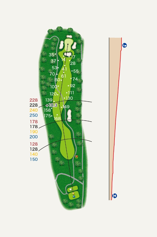 やや打ち上げの短いパー4。ティーショットは左サイドが狙い目。グリーン手前のバンカーはアゴが高く打ち上げのため高い球が要求される。グリーンは左奥より右手前にかけて速い。