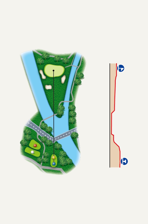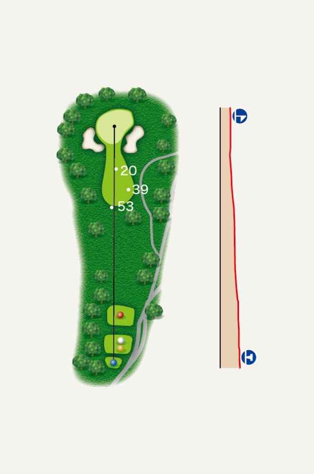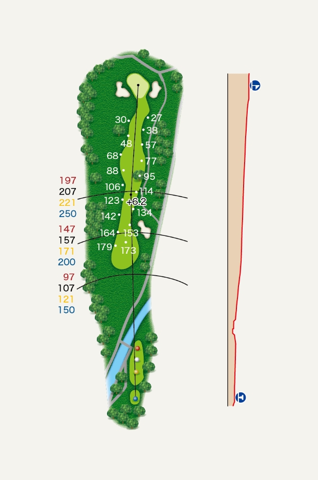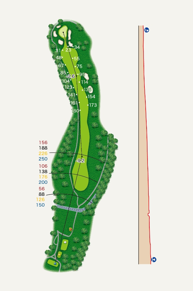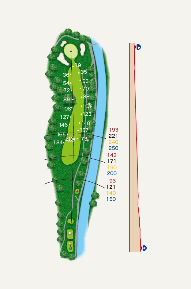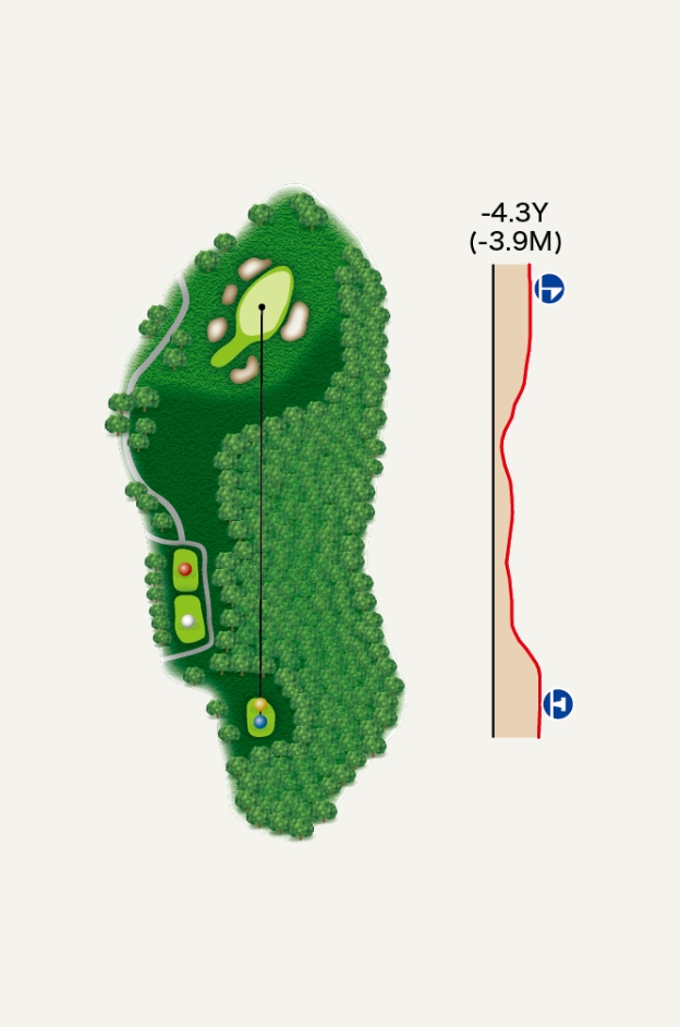 やや打ち上げの短いパー4。ティーショットは左サイドが狙い目。グリーン手前のバンカーはアゴが高く打ち上げのため高い球が要求される。グリーンは左奥より右手前にかけて速い。