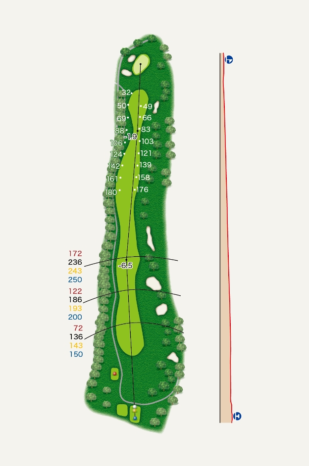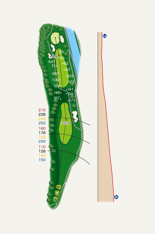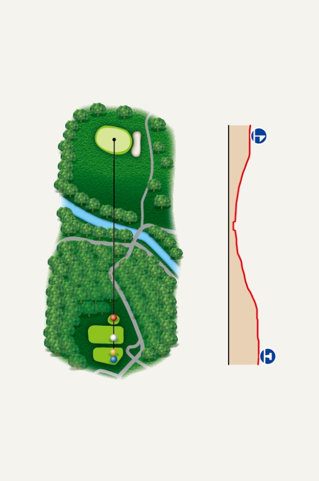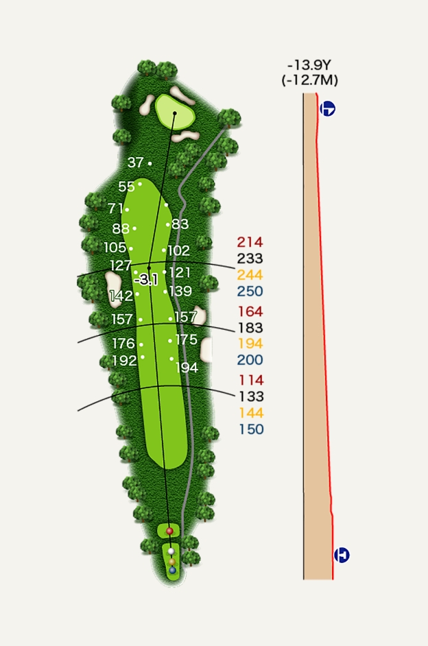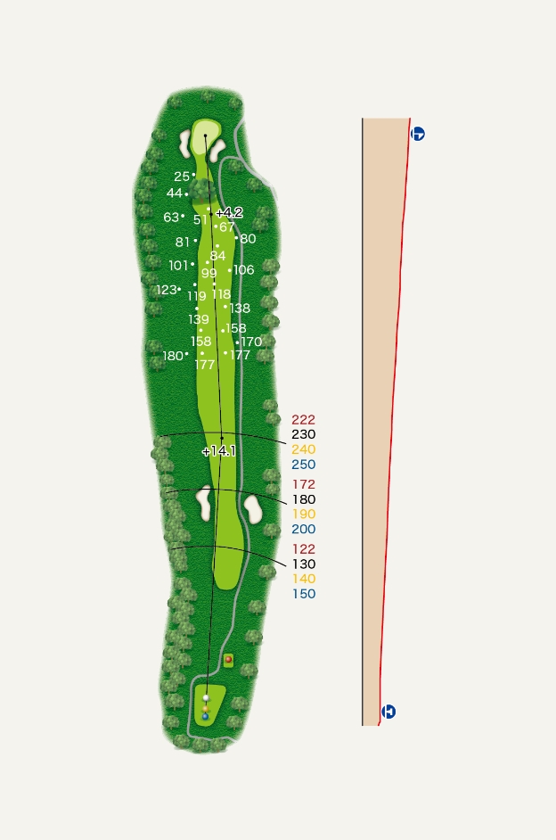 グリーンまで障害物はないためティーショット・セカンドともに思い切りせめたいが、全体的に緩やかな左足下がりとなっているため球筋に注意したい。グリーンは2段だが手前から速い。
